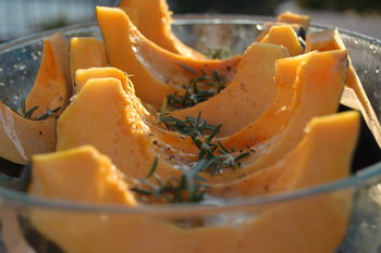 Egyszerűbb a dolgunk, ha a darabokból rozmaringgal sütött sütőtököt készítünk. A tökdarabokra daráljunk borsot, tépkedjünk rá rozmaringleveleket, csorgassuk meg olívaolajjal, majd fél óra állás után terítsük szét egy sütőpapírral borított tepsin. Félórai sütés után máris tálalható sült csirke vagy sült pecsenyék mellé.