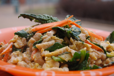 Öntsük a liszteket egy nagy tálba, üssünk rá két egész tojást, majd ízesítsük egy teáskanálnyi sóval, majd hideg vízzel keverjünk belőle galuskatésztát. Forraljunk fel egy fazékban sóval ízesített vizet, majd szaggassuk bele a nokedlit. Ha elkészült szűrjük le, és jól öblítsük le hideg vízzel és hagyjuk jól lecsepegni. Amíg a galuska csepeg, készítsük el a zöldségeket. Forrósítsuk fel egy nagy serpenyőben az olívaolajat, majd tegyük bele a vékony gyufaszál nagyságúra felcsíkozott cukkínit, sárgarépát és karlábét. Közepes lángon pároljuk két-három percig. Üssünk fel négy tojást egy tálba, tegyünk hozzá egy csipetnyi sót, majd jól verjük fel. Öntsük a zöldségekre, keverjük jól össze, és tegyük hozzá a kifőzött galuskát, szórjuk rá a spenótleveleket, és addig hevítsük, míg a tojás kellően megszilárdul. Ha elkészült szórjuk meg bőven az összevágott petrezselyme zöldjével. Még forrón tálaljuk tányérokra. Önállóan is fogyaszthatjuk, de körítésnek is kínálhatjuk borjú vagy csirkepaprikás mellé.