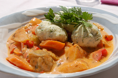 Tálaláskor szedjünk a zöldségpaprikásból egy adagnyit leveses tányérba, és tetejére tegyünk pár szem gombócot. Összevágott friss petrezselyem zöldjével vagy kaporral szórjuk meg.