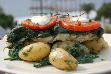 Vágjuk egyforma darabokra a tőkehalfilét, majd csorgassuk meg olívaolajjal, daráljunk rá borsot és szórjuk meg halfűszer-keverékkel. Fedjük le fóliával, és kis időre tegyük a hűtőszekrénybe, hogy a fűszerek íze jól átjárja a halhúst. Készítsük el hozzá a spenótot. Forrósítsunk fel egy kis lábasban egy evőkanálnyi olívaolajat, majd tegyük bele az összezúzott fokhagymát. Forrósítsuk össze, és utána tegyük rá a leforrázott és kinyomkodott spenótleveleket. Fűszerezzük őrölt szerecsendióval, darált borssal és kevéske sóval. Fedjük le és kis lángon pároljuk 4-5 percig, ha elkészült hagyjuk kissé kihűlni. Tegyünk egy ív sütőpapírt egy tepsi aljára, majd helyezzük el rajta egymás mellé a befűszerezett halszeleteket. Halmozzuk rá a megpárolt spenótot, vigyázzunk a párolólevéből ne tegyünk a halra, kissé nyomjuk ki a kanálállal. Tetejére szeletelt paradicsomot tegyünk, tépkedjünk rá kakukkfűleveleket, daráljunk rá borsot, majd kanalazhatunk rá tejfölt vagy tejszínt. Csorgassuk meg olívaolajjal és forró sütőben 150 fokon pároljuk készre 10-12 perc alatt. Ha elkészült lapátkanállal helyezzük nagy tányérokra, köretnek petrezselymes burgonyát készítsünk hozzá.