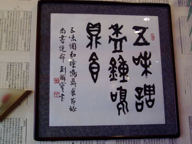 A falat ötezer éves kínai betűkből kirakott versidézet díszíti, nehéz megérteni, mondja kínai kísérőm, mert ezeket az írásjeleket már nem használják. Egy nagy teáskannában krizantém virágból készített teát hoznak, nemcsak szép, de nagyon finom. Ízesítés nélkül isszuk, itt így szokás, ha kiürül, forró vízzel újratöltik, és kortyolgathatjuk tovább. Az első fogás az ötízű marha, hasonlít a mi disznósajtunkhoz, csak ők marhából készítik, szójaszószt, mogyorót, fokhagymát és gyömbért használnak az ízesítéséhez. Mellé wokban hirtelen megsütött zöldbabhajtásokat és kukoricakalácsot kapunk. Hoznak még csípős paprikával és póréhagymával összesütött császárhúst. A fogások állandóan cserélődnek, nem győzöm az ízeket felfedezni.
