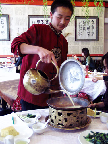 Az asztalnál friss szójaaludttejet készítenek, egy szép rézedénybe langyos szójatejet csorgatnak, majd letakarják, és várnak tizenöt percig. A tej a melegtől megalvad, ezt összevágott korianderlevéllel, csípős paprikával, szójaszósszal, finomra vágott gyömbérrel és gombákkal keverik össze, kis tálkákba tálalva a főétel után fogyasztják.
