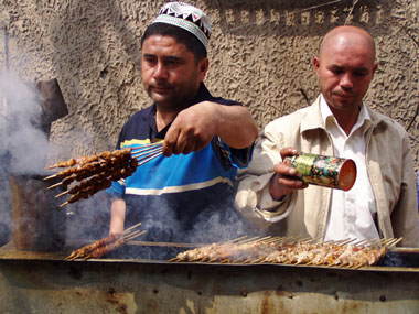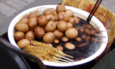 Sanghaj egyik legzsúfoltabb utcája nem az elegáns éttermeiről híres. Itt a flaszteren, falatnyi tűzhelyen készülnek a harapnivalók. Bambuszpálcikákra fűzött csirkecsíkokat sütnek, amit fűszerekkel szórnak meg, de hogy még pikánsabb legyen, a szénre benedvesített teafüvet szórnak. Így készül a teával füstölt csirke.