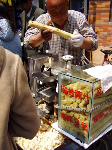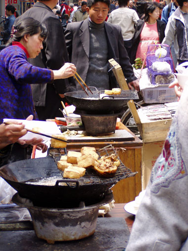 Szójaszószba áztatott, magokba hempergetett tofut forró olajban rántanak ki, picinyke papírzacskóba teszik, erős mártással csorgatják meg, és pálcikákkal fogyasztják. Vaníliás gofri készül forró öntöttvas formákban. Finom az illata. A palacsintatésztát kis kockányi mélyedésekbe töltik, letakarják, és a megsült apró kockákat zacskókban árulják.