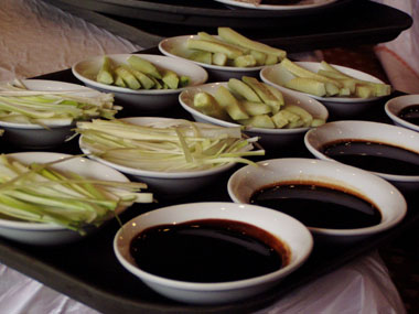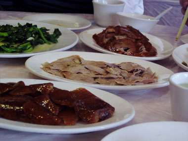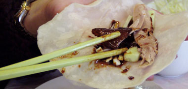 Közben kifaggattam a szakácsokat a pekingi kacsa titkáról. Negyven perc alatt kell elkészülnie, fontos a kacsa nagysága, nem lehet túl nagy, zsíros és túl öreg sem. 138 szeletre kell hogy vágják. A megtisztított kacsa gégéjét óvatosan ki kell húzni, majd visszadugva levegőt kell belefújni. A szárnya alatt éles késsel be kell metszeni a bőrt, majd a belsőséget ki kell szedni. Egy fapálcával ki kell támasztani a gerinc és a mellcsont közötti részt, nehogy összelapuljon. A hasüreget többször hideg vízzel át kell mosni, majd horogra akasztva forró vízzel addig locsolgatni, míg a bőre össze nem megy.