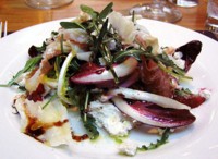 Előételként Jamie fantasztikus salátáját választom. Téli salátalevelek (cikória, pitypanglevél, bébi spenót, ruccola, trevisói radiccio) amit sült buffalo ricottával (bivalytejből készült lágy sajt) bőven megszórtak, vérnarancsgerezdekkel megtűzdelték, parmezánforgácsokat faragtak rá, és az egészet Beluza balzsamecettel, valamint olívaolajjal csorgatták meg. A salátában elbújtattak itt-ott néhány levél friss mentát is. Izgalmas startolás!