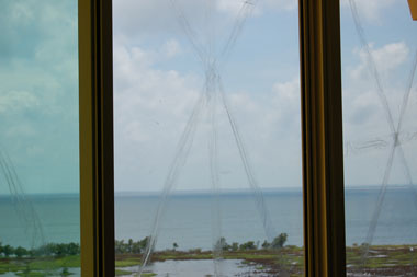 A berobbanó üvegek ellen, széles ragasztószallaggal ragasztották be az összes ajtót, ablakot.