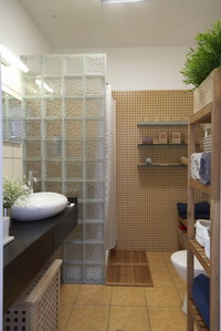 "Kellemes látvány az üvegcsempés zuhanyfülke és a fürdőszoba raszteres csempeborítása, amely a konyha faláról már ismerős lehet. A bútorzat - a lebegő üvegpolcok, a könnyed, nyitott állópolcok és a rácsos szennyestartó - az IKEA-ból származik"