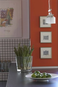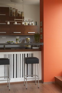 "A Konyha a nappali teréhez csatlakozik, a pult falát meglepő és szellemes dekoráció, egy rizsesdobozról felnagyított vonalkód díszíti"