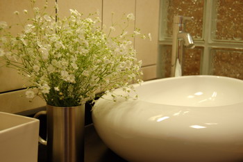 "A fürdő valódi ékessége a koptatott tengeri kavicsra emlékeztető formájú, pultra ültetett, ovális mosdótál"