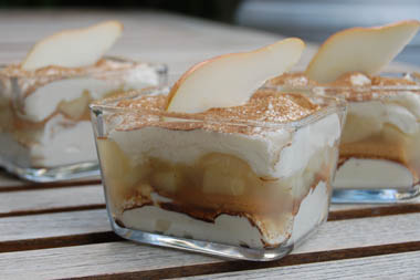A babapiskótákat mártogassuk be szűrt almalébe, majd sorban rajuk le egy üvegtál aljára. Tetejére osszuk szét a kompót felét, majd a mascarpónés sajtkeverék felét, kissé simítsuk el, majd ismételjük meg a rétegezést. A tetejét a durvára vágott és megpirított mogyoróval szórjuk meg. Pár órára tegyük hűtőbe, hogy jól összeérjenek az ízek. A birsalmát helyettesíthetjük zöldalmával vagy körtével is.