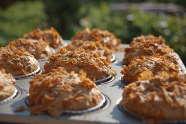 Öntsük egy keverőtálba az olvasztott vajat, majd adjuk hozzá a barnacukrot. Üssük bele a tojásokat, kanalazzuk bele a joghurtot és a mézet, tegyük hozzá a kakukkfűleveleket és a narancs lereszelt héját. Fakanállal, vagy habverővel jól dolgozzuk össze. Egy másik tálba szórjuk a lisztet, tegyük hozzá a reggeliző pelyhet, sót és a sütőport, és egy kanállal keverjük össze. Kis adagokban dolgozzuk a tojásos keverékhez, csak addig keverjük, míg teljesen elvegyülnek az alapanyagok. Béleljünk ki papír kapszulákkal egy 12 darabos muffin sütőt, majd töltsük meg háromnegyedig a kész masszával, és a tetejére szórjunk a reggeliző pehelyből. Tegyük előmelegített sütőbe, és 160 fokon süssük 25-30 percig. Még melegen reggelire vajjal megkenve, kávéval vagy teával fogyasszuk.