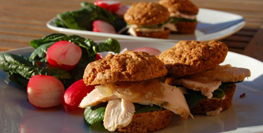 A muffinhoz tegyük egy kis tálba a lisztet, szórjuk rá a sütőport, a szódabikarbónát és a sót, majd kanálla keverjük össze. Egy másik keverőtálba üssük a tojást, adjuk hozzá a tejet, az olvasztott vajat, cukrot és egy narancs lereszelt héját. Fakanállal keverjük jól össze, majd szórjuk bele a lisztes keveréket is. Fakanállal jól dolgozzuk össze. Töltsünk meg a masszával háromnegyedig jól kivajazott és liszttel megszórt muffin sütőformát, majd tegyük előmelegített sütőbe, és 150 fokon süssük 20-25 percig. Ha elkészült, várjunk vele míg kissé kihűl, majd szedjük a formából, és hagyjuk teljesen kihűlni. Szendvicsekhez vágjuk derékban kétfelé a muffinokat, kenjük meg majonézzel, helyezzünk rá pár levél spenótot, majd hajtogassunk rá a vékonyra felszeletelt füstölt pulykából. Tetejére kanalazzunk a hagymalekvárból, majd helyezzük vissza a levágott fedelét. Friss ropogós vajretekkel és salátalevelekkel fogyasszuk. Elkészíthetjük maradék csirke, marha vagy sertéssültből is. Hagymalekvár helyett tehetünk rá chutney-t, paprika vagy vörösáfonya lekvárt, de nagyon finom frissen felszeletelt almával, körtével is.