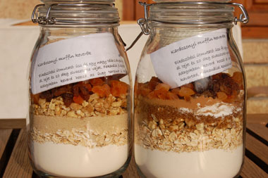 "Nesze neked muffin, süsd meg magad!" Ötletes ajándékkal lepheted meg a sütni és főzni szerető ismerőseid, ha üvegbe zárt sütemény hozzávalókat raksz a fenyőfa alá. Ajándék mustra következik!