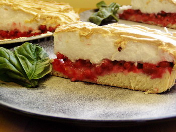 Az élesztőt morzsoljuk bele egy kis tálkába, öntsünk rá pár kanál langyos vizet és adjuk hozzá a cukrot. Keverjük össze és várjuk meg még a kovász kelni kezd. Egy keverő edénybe szitáljuk a lisztet, kanalazzuk bele az olajat és ízesítsük egy csipetnyi sóval. Öntsük bele a kovászt, és dagasztógéppel kezdjük el keverni. Annyi vizet adjunk hozzá, hogy kenyértészta sűrűségűvé tudjuk dagasztani. Tegyük langyos helyre és várjuk meg még kétszeresére dagad. Még a tészta kel, készítsük el a tölteléket. 130 gr cukrot tegyünk egy kis lábasba, öntsünk rá fél liter vizet és addig főzzük még mézsűrűségűre nem sűrűsödik. Ha elkészült vegyük le a tűzről, vigyázzunk, ha nagyon kihűl megszilárdulhat. Egy keverő tálba tegyük a tojások fehérjét, adjuk hozzá a maradék cukrot, majd elektromos habverővel verjük kemény habbá. Ha már nagyon kemény csorgassuk bele a cukorszirupot és még további 2-3 percig verjük. A megkelt tésztát borítsuk egy lisztezett deszkára, nyújtsuk ki egy centi vastagságúra. Kivajazott és liszttel megszórt 40X20 centiméter átmérőjű tepsibe borítsuk, jól igazgassuk el a széleit. Szórjuk rá a megmosott ribizli szemeket, majd az egészet vonjuk be a cukros tojásfehérjével. Előmelegített sütőben 140-150 fokon süssük 35-40 percig. Ha kissé kihűlt szeleteljük fel.