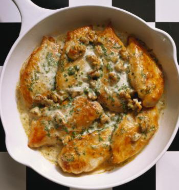 Hozzávalók: 4 db csirkemell filé, 1 pohárnyi fehér szárazbor, 2 szál újhagyma, másfél decinyi tejszín, 1 evőkanál ecetestorma, 2 evőkanál mustár, 2-2 ág friss tárkony, snidling, petrezselyem zöldje, bazsalikom (ha nincs friss fél-fél teáskanálnyi szárítottal is elkészíthetjük), 2 evőkanál vaj, 2 evőkanál olívaolaj, fél darab zöldségleves kocka, darált bors.