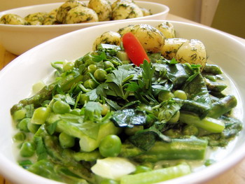 Tisztítsuk meg a spárgákat, fás végét vágjuk le, vágjuk három centis darabokra, majd mossuk meg alaposan. Forrásban lévő sós vízben főzzük két-három percig, majd azonnal szedjük át hideg vízzel telt edénybe. Ha kihűlt csepegtessük le jól. Egy közepes méretű lábasban forrósítsuk fel a vajat, tegyük bele a felkarikázott újhagymát, majd pároljuk pár percig. Adjuk hozzá a zöldborsót, öntsünk rá a zöldséglevesből, sóval, kevéske őrölt fehérborssal ízesítsük, és lefedve pároljuk, még a borsó puha lesz. Ha a pároló levét is elfőtte, szórjuk rá a lisztet, keverjük össze, majd öntsük rá a maradék levest (ha nincs levesünk, vízzel elkevert zöldségleves kockát is használhatunk), és dúsítsuk tejszínnel. Adjuk hozzá a megmosott és nagyobb darabokra tépett spenótot, majd ha összeesett tegyük bele a leforrázott spárgát is. Jól forraljuk össze és a végén kevéske citromlével, és reszelt citromhéjjal tegyük még pikánsabbá. Körítésnek kapros újburgonyát készítsünk.
