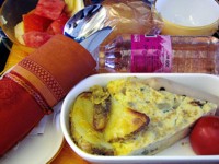 Hosszú az út Sanghajig, de nem kellett éheznem a repülőn. Aperitif után szolgálták fel a vacsorát. Előételnek füstölt lazacot kaptam majonézes-kapros káposztasalátával, utána csirkét kínai babszósszal, amit hosszú szemű rizzsel körítettek, majd epres-joghurtos tortával és szerencsesütivel zártuk a menüt. Kis szunyókálás után citromos fagyi és kínai tésztaleves közül választhattam.