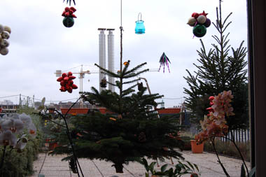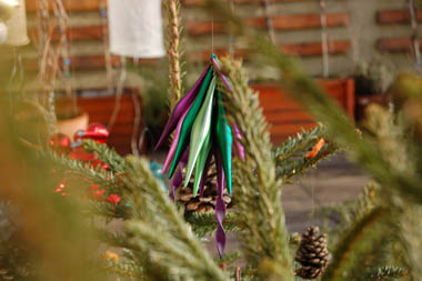 Karácsonyfa a szobából nézve, állandó mozgásban vannak a díszek és a fa
