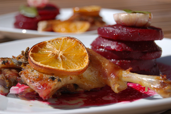 Tegyük a libacombokat egymás mellé egy nagy tepsibe, majd csorgassuk meg az olívaolajjal. Sózzuk meg mindkét felét, utána daráljunk rá borsot, tépkedjünk rá a kakukkfű és zsályalevelekből. Igazítsuk el úgy a tepsiben, hogy a bőrős fele legyen felfelé. Reszeljük rá az egyik narancs héját, majd nyomjuk ki a levét, és csorgassuk meg vele a combokat. A másik narancsot szeleteljük fel, és borítsuk be vele a húst. Öntsünk alá két decinyi vizet, majd az egész tepsit fedjük be alufóliával. Tegyük előmelegített sütőbe, és 160-170 fokon süssük egy órán keresztül. Mielőtt kivennénk a sütőből, vegyük le róla a fóliát, nézzük meg egy késsel, hogy a hús eléggé megpuhult-e. Ha még kemény, fedjük vissza az alufóliával, és pároljuk még további 30-40 percig. Befejezés előtt süssük fólia nélkül pár percig, hogy ropogós piros legyen a pecsenye. Köretnek fokhagymás céklát készítsünk hozzá. A megfőzött céklákat vágjuk újjnyi vastag szeletekre, majd tegyük egy olívaolajjal kikent tepsibe. Reszeljünk le két-három gerezd fokhagymát egy kis tálba, csorgassunk rá pár evőkanál olívaolajat, keverjük jól össze, majd csorgassuk meg vele a céklát. Daráljunk rá borsot, és szórjuk meg sóval. Óvatosan, vigyázva, nehogy összetörjenek a szeletek, kissé keverjük meg. Fedjük be alufóliával, és fél órán keresztül, akár a libával együtt süssük készre.