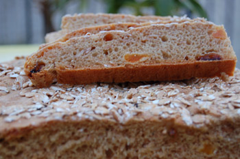 Szórjuk a lisztet egy dagasztó edénybe,adjuk hozzá a mazsolát az összevágott aszaltbarackot,olívaolajt, diót vagy mandulát, és a napraforgómagot. Csorgassunk hozzá 6 dl langyos vizet, majd kezdjük el keverni. Addig dagasszuk, míg a tészta az edény falától kezd elválni. Tegyük a tésztát langyos helyre, fedjük le tiszta konyharuhával, majd kelesszük kétszeresére. A megkelt tésztát borítsuk liszttel meghintett deszkára, gyúrjuk át jól, majd osszuk kétfelé. Nyújtsuk egy centi vastagságúra, hajtsuk rá a sodrófára és terítsük egy sütőpapírral borított sütőlemezre. Tetejét kenjük meg vízzel, majd szórjuk meg zabpehellyel. A másik adag tésztát is hasonlóan készítsük el. Kelesszük még további 15 percig, majd előmelegített sütőbe téve, 170 fokon süssük körülbelül 30-35 percig. Fogyasszuk sajtok, pástétomok, és kenyérre kenhető kencék mellé. De készülhet belőle uzsonnára szendvics is. Azt a kenyeret elkészíthetjük, szinte bármilyen más aszalt gyümölccsel és olajos maggal, de használhatunk hozzá rozs és árpapelyhet is.