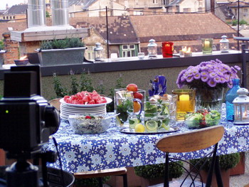 Sütöttem frissen kenyeret, rozmaringgal és aszalt paradicsommal. Felkockáztam és egy vázában raktam az asztalra. Görögdinnye salátát készítettem fetával és sok-sok mentával, majd pesztós rizssalátát készítettem köretként. Csirkemell szeleteket fűztem fel koktélparadicsommal, amit sok-sok gyógyfűszerrel (kakukkfű, bazsalikom, rozmaring) pácoltam, ezt faszénparázson sütöttem meg. Került még az asztalra a híres paprikalekváromból, de nem hiányozhatott a hideg sör sem.