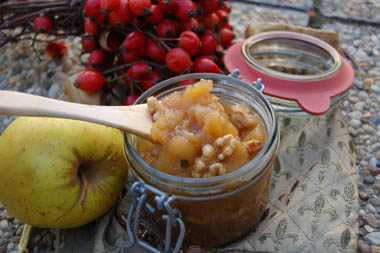 Hozzávalók: 1 kg savanykás alma, 10 dkg vaj, 20 dkg barnacukor, 2 db citrom, 2 db babérlevél, 5 cl konyak vagy whisky, 2 maréknyi dióbél.