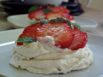 Négy tojásfehérjéből, 20 dkg cukorból egy teáskanál ecet segítségével verjünk kemény habot. Tegyük egy nyomózsákba, majd nyomjunk egy sütőpapírral borított tepsire tenyérnyi kör alakzatokat, úgy, hogy a belsejét is töltsük meg a habbal. Meleg, 120 fokos sütőben körülbelül egy órán keresztül szárítsuk. Ha elkészült az alap, akkor pakoljuk meg eperszemekkel és csorgassuk meg édes pestóval.